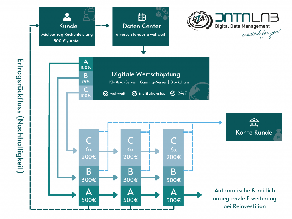 DataLab bietet Ihnen die Möglichkeit über Rechenleistungsanteile mit automatischer Leistungsanpassung in die für die Blockchain notwendige Technologie zu investieren.